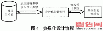 基于Pro/Toolkit 三維參數化設計的開發方法有2 種:①應用特征描述法利用Pro/Toolkit 提供的底層函數完成特征建模,并建立人機對話框,實現三維參數化設計,此方法程序設計繁瑣,對于形狀復雜的產品來說,用程序來生成三維模型非常困難; ②采用三維模型與程序控制相結合的方式,基本過程為在Pro/E環境下利用交互方式生成三維模型,然后在已創建的零件三維模型的基礎上,根據零件的設計要求建立一組可以完全控制三維模型形狀和大小的設計參數。參數化程序針對該零件的設計參數進行編程,實現設計參數的檢索、修改和根據新的參數值生成新的三維模型的功能,其流程如圖4 所示。此種方法可以生成形狀復雜的產品模型,編程相對來說較簡單,被廣大開發者采用。
