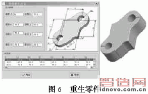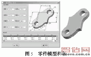用程序控制模型進行三維參數化設計的開發,主要包括3 項:參數對象的獲取和顯示;參數對象的更新修改;模型的再生。圖5、圖6 為利用所述方法開發的一個例子。圖5 為零件模型樣板,可以改變其中一參數大小進行零件重生, 還可以從列表中選擇參數系列值進行零件重生,圖6 即為將厚度改為50 min 后重生零件情況。