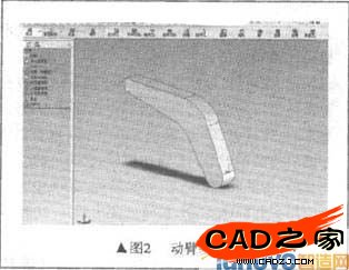 1)首先選取前視基準面為草圖繪制平面,并利用拉伸特征建立動臂基體,如圖2所示。