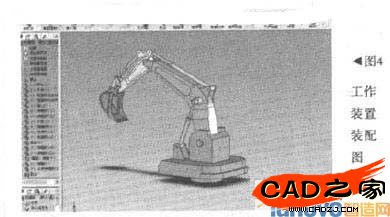 本裝配體在裝配時采用自下向上設計方法,即首先利用拉伸、陣列、切除等基本功能建立挖掘機工作裝置各個零部件圖,在裝配時先確定挖掘機底座作為固定件,其他的零件在固定件上按照裝配關系依次導人進行裝配,各個零件之間可加上所需的約束關系,如同軸、兩平面平行、兩平面重合等,這些約束使得到的裝配體更接近實際裝配體,整個裝配過程猶如在實際生產中進行實物組裝一樣,較為逼真。最終得到的工作裝置裝配圖如圖3所示。