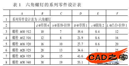 對于公司的系列零件及標準件可以先創建零件圖模板,以供隨時調用,避免重復勞動。由于SolidWorks軟件是一個OLE/2應用軟件,因此Excel的電子表格可用于建立設計表并輸入到SolidWorks中。先用SolidWorks創建一個實體零件,再插入系列零件設計表以建立不同的配置用來驅動不同系列零件。配置適用于兩個或兩個以上的零件具有相同的特征,但在一些局部特征或局部尺寸上又存在著一定差異的情況。合理地使用配置,對零件系列、產品系列開發與管理有非常重要的意義。配置為產品設計提供了快捷有效的設計方法,最大限度地減少了重復設計,同時也減少了設計錯誤。Excel電子表格用來設定配置名稱(列A)和尺寸或特征名稱(行2),每一個配置的尺寸值放在內部對應的單元格中,如表1所示。對于需要系列驅動的尺寸,使用尺寸的全名"(尺寸名@特征名")插入到系列零件設計表中;對于特征的狀態,用"|S狀態@特征名"的格式插入。另外備注列和用戶注釋列可用來給各個配置增加文本字符串,使用格式為"|S備注"和"|S用戶注釋"。在應用時,調用相應的零件配置即可。
