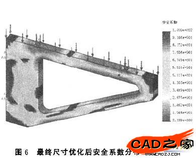重新建立一優(yōu)化研究,定義優(yōu)化品質(zhì)為高,添加優(yōu)化研究目標(biāo)為最小體積,設(shè)計變量選中開孔的關(guān)鍵尺寸,定義變量的變化區(qū)間,使孔尺寸可以向大值方向發(fā)展。在約束條件下添加應(yīng)力為靜態(tài)節(jié)應(yīng)力,界限為ON/m2~2 X lO8/m2;添加最大合力位移,界限為Omm ~ 0.2mm;添加基礎(chǔ)頻率的變化范圍為330Hz~420Hz。運(yùn)行尺寸優(yōu)化分析后,COSMOSWorks將會進(jìn)行一系列的優(yōu)化分析,經(jīng)過若干循環(huán)之后,給出了最終的優(yōu)化結(jié)果,見圖4。通過對優(yōu)化后的模型進(jìn)行分析,可以看出,本次優(yōu)化設(shè)計的最終迭代數(shù)為15,改進(jìn)后托架的硬度、強(qiáng)度、形變?nèi)匀荒艹浞譂M足要求,見圖5。開孔尺寸比要求更大,能在安裝更為方便的同時減輕托架重量,最終設(shè)計的最小安全系數(shù)控制在2. 3左右,見圖6。將優(yōu)化設(shè)計的數(shù)值進(jìn)行數(shù)值規(guī)整、重新校核后即可完成本次改型設(shè)計。