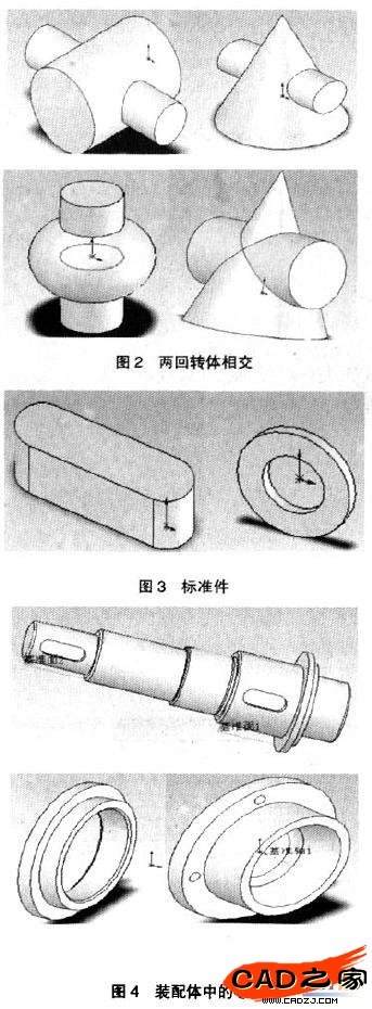 如在組合形體庫中,利用拉伸特征和旋轉(zhuǎn)特征建立了兩回轉(zhuǎn)體相交的下維模型,如圖2所示.
