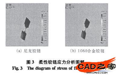 材料選擇上,為了達到要求的行程,柔性鉸鏈的變形是首先要考慮的,較為理想的彈性材料有鈹青銅、鈦合金、彈簧鋼等.初選兩種鉸鏈材料一尼龍和1060合金.通過有限元分析軟件COSMOSXpress,分析尺寸為t=2mm,r=3mm的兩種材料鉸鏈在最大受力下的應力分布情況,如圖3所示.
