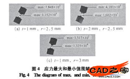 初選柔性鉸鏈的3種尺寸組合:t=1mm,r=2.5 mm;t=2mm,r=2.5 mm;t=l mm,r=3 mm.通過有限元分析軟件COSM0SXpress,分析3種t和r組合的柔性鉸鏈的應力分布情況.選項中設置在應力圖解中為最大和最小值顯示注解,如圖4所示.比較圖4(a)和(b),發現當柔性鉸鏈的半徑不變,厚度發生變化時,其最大應力發生了很大的變化.而保持厚度不變,改變鉸鏈的半徑,如圖4(a)和(c),發現鉸鏈的最大應力沒有明顯的變化.由應力圖解可知:柔性鉸鏈最小厚度的變化對鉸鏈特性影響最顯著,而切割半徑相對影響較.