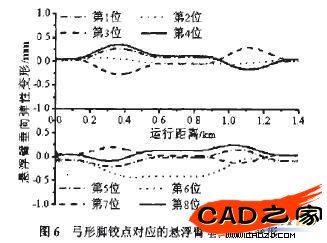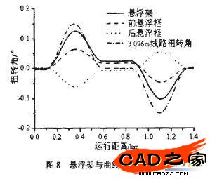 圖5和6還表明懸浮架的彈性變形主要在緩和曲線段得到反映,在圓曲線上彈性變形有較大的復(fù)原,近似為一較小值。在直線段上懸浮臂彈性變形極小(為保持懸浮架初始不變形,已對(duì)其施加預(yù)應(yīng)力),這是因?yàn)榍€線路橫坡角在緩和曲線段逐漸變化,而在圓曲線上為一定值(扭轉(zhuǎn)率為零)。在前緩和曲線段,前懸浮框正向扭轉(zhuǎn),后懸浮框反向扭轉(zhuǎn),在后緩和曲線段則剛好相反;前、后緩和曲線上懸浮架的扭轉(zhuǎn)變形方向相反,這與緩和曲線理論是吻合的。