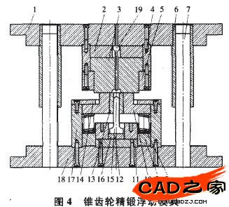 下凹模13空腔內,待毛坯放置好后,上模3下行;當上模3開始接觸毛坯時,縮擠形成開始;隨著上模3的繼續下壓,應力圈10由于受到壓力作用,擠壓下部的彈簧并隨之下移,坯料進入封閉狀態的模腔內,縮擠完成,開始鐓擠成形階段;上模3繼續下移,至達到規定行程為止。上模回程后,下凹模13和應力圈10在彈簧8的作用下恢復初始狀態。成形后的錐齒輪鍛件在上頂桿19的作用下脫模,取走鍛件,至此錐齒輪精鍛成形過程完成。