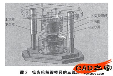 齒形凹模是錐齒輪精鍛成形最關鍵的零件,它的精度決定錐齒輪鍛件的精度。齒形凹模的強度和壽命不僅要從所用材料上來考慮,更要從凹模的結構設計上來保證。為了提高齒形凹模的強度,采用組合式結構。采用浮動的上模芯和浮動的下組合模套結構,使鍛件在封閉的環形模腔中變形,鍛件無飛邊,徑向尺寸精度高。由于鍛件無飛邊,水平投影面積(鍛造面積)小,所需的鍛造力小,降低了壓力機噸位。由于采用浮動模結構,浮動模形成的凹腔較深,確保上下模導向準確。此模具利用彈簧實現壓邊,實現閉式模鍛。