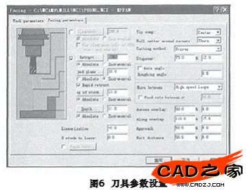 然后經(jīng)過不同步驟的①加工部位選取、②刀具選擇、③刀具參數(shù)設(shè)置(圖6)、④加工路徑設(shè)置、⑤粗加工參數(shù)設(shè)置、⑥精加工參數(shù)設(shè)置等設(shè)置,最終完成手機殼的數(shù)控自動編程。選取圖示邊線并按圖進行設(shè)置。