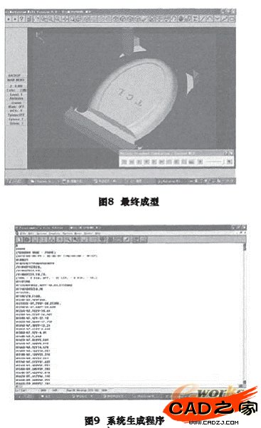 完成上述各種工藝參數(shù)設(shè)置,經(jīng)過下述加工步驟仿真(圖7),最終成型如圖8。①外形銑削;②文字上表面銑削;③殼體上表面銑削;④圓周粗加工;⑤系統(tǒng)生成程序(圖9)。