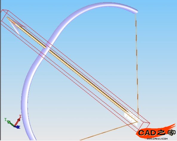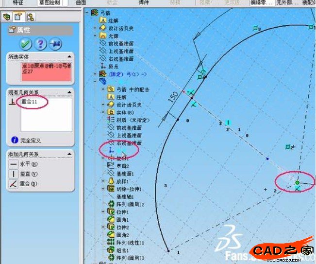 第三步:裝配,只添加同軸約束。然后在裝配體下編輯弓零件中上一步建立的草圖,并添加拖拽點(diǎn)與箭桿的重合關(guān)系。如下: