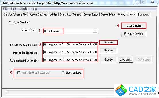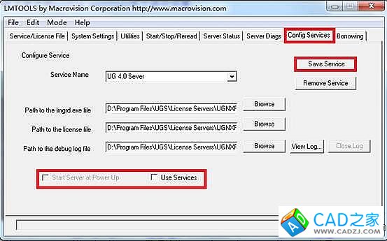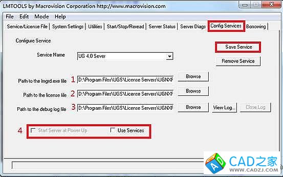 Service Name是什么沒有影響,我們需要設(shè)置的是下面三項,分別點擊后面的Browse,指向剛才打開文件夾內(nèi)的lmgrd.exe、ugnx4.lic和ugflexlm.log,注意最下面紅框內(nèi)的不要選上!最后點一下Save Service即可關(guān)閉退出。
