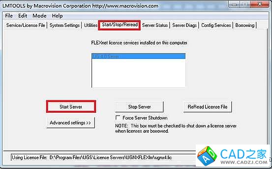5.最后一點:UG4.0在WIN7下每次開機第一次打開UG軟件的時候,都要打開lmtools,在下圖下面的紅框點一下start sever,以手動打開服務(wù)。
