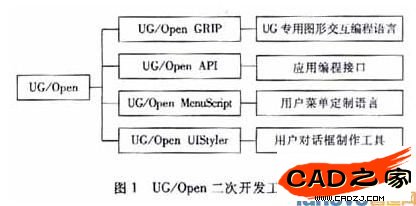UG軟件提供了CAD/CAE/CAM業界最先進的編程工具集,以滿足用戶二次開發的需要,這組工具集稱之為UG/Open,是一系列UG開發了具的總稱,它們隨UG—起發布,以開放性架構面向不同的軟件平臺提供靈活的開發支持,UG/Open套件主要由4個開發工具組成,如圖1所示。利用UG/Open提供的應用程序和開發工具,用戶可以在其提供的平臺上開發出適合自己需要的CAD產品。