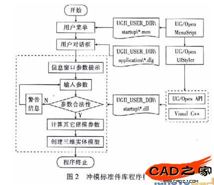 標準件庫的建立綜合運用了上述UG/OpenMenuSript、UG/Open UG/Open UIStyler、UG/Open API他Visual C++6.0等UG二次開發關鍵技術.其程序框如圖2所示。其中,利用UG/Open MenuSeript編寫用戶菜單,直接掛在UG系統的主菜單上,形成與UG融合統個的界面;利用UG/Opea UISlyler制作UG風格的對話框,供用戶萊單調用;通過Visual C++和UG/Open APl編寫參數化設計應用程序,并生成動態鏈接庫(Dynamic Link Library)文件,在UG啟動時自動加載,實現了對UG的底層開發。