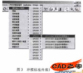 為了與uc交互界面風格保持一致,沖模標準件庫采用了分級式下拉菜單,如圖3所示,下拉菜單通過UG/Open MenuScript模塊開發實現。即利用MenuScript提供的UG菜單腳本語言,編寫成擴展名為*.men的文本文件,將其放在用戶目錄下的/startup目錄內,通過設定uC的環境變量,uC在啟動時會自動加載用戶菜單文件,通過成uC用戶菜單。